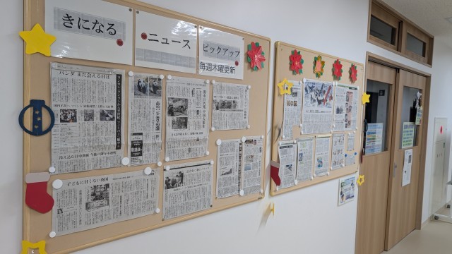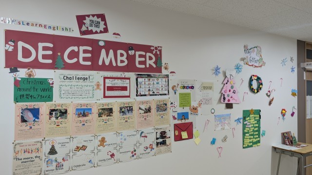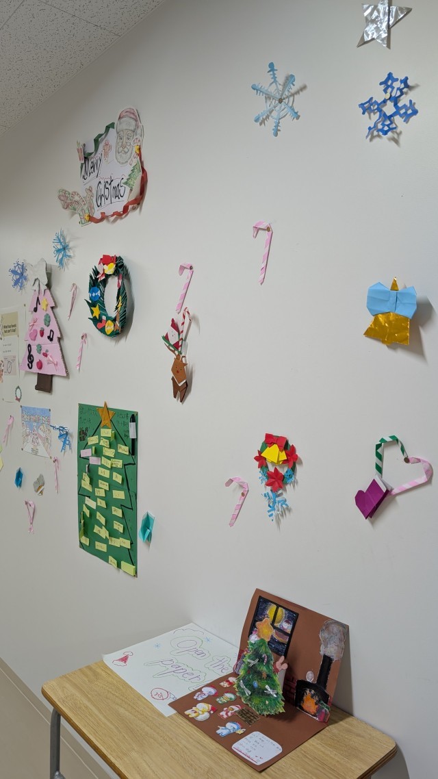 また、学習情報センターの壁面には、ALTの先生や図書司書さんがクリスマスの飾り付けをしてくれています。