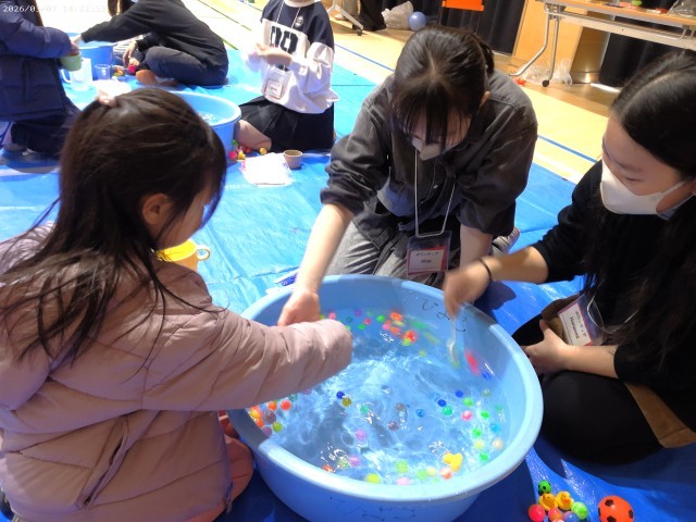 スーパーボールすくいでは、挑戦する子の年齢などに合わせて水の流れの速さに変化をつけたり、