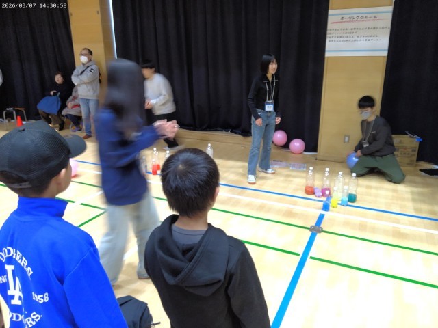 写真は、生徒会とボランティアがPTAのみなさんの協力を得て工夫を凝らしたスーパーボールすくいとボウリングの様子です。