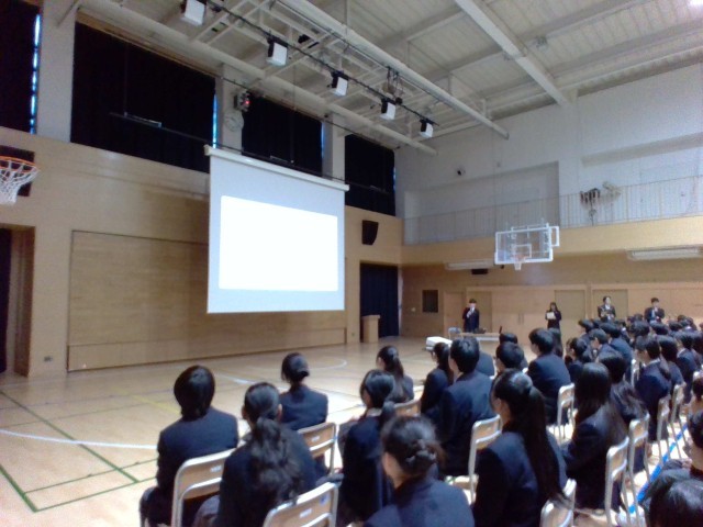 4月8日(水)全校集会が行われました。生活指導主任の号令で全校生徒が声をそろえて朝の挨拶をして始まりました。生徒一人ひとりが充実した学校生活を過ごしていくために、学習に取り組むときの心構えや生活のきまり、特別支援教室Sルームについて、担当の先生からお話を伺いました。さらに、生徒会の委員会や生徒会本部からスライドを使用して、わかりやすく説明や紹介がありました。新たに挑戦する自分の役割について考える時間にもなりました。
