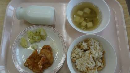 5月9日(月) ・きつねごはん ・根菜のすまし汁 ・鶏ささ身のレモン風味 ・青のりポテト
