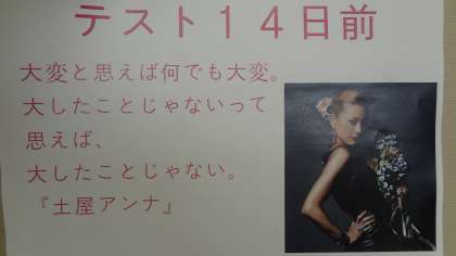6月9日(木)今月の22日から3日間は、1学期期末考査が始まります。生徒会役員は、みんなに学習への意識を高めてもらうために、テストまでの日めくりカレンダーをつくりました。芸能人や著名人の言葉もあわせて載せています。