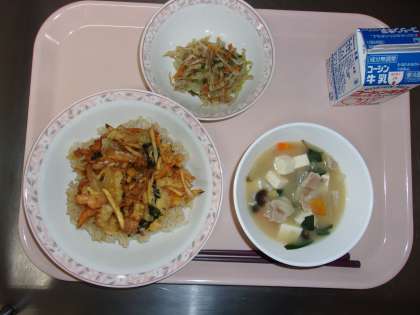 牛乳 カラフルかき揚げ丼 豚汁 野菜の梅和え