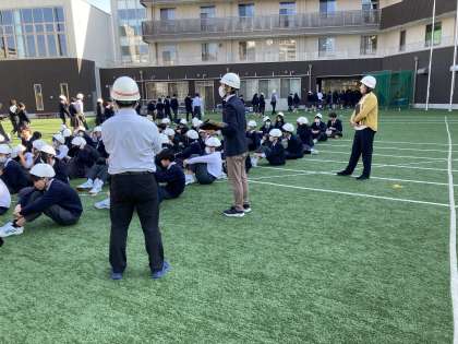 地震を想定した訓練、教室に備えてあるヘルメットをかぶって避難しました