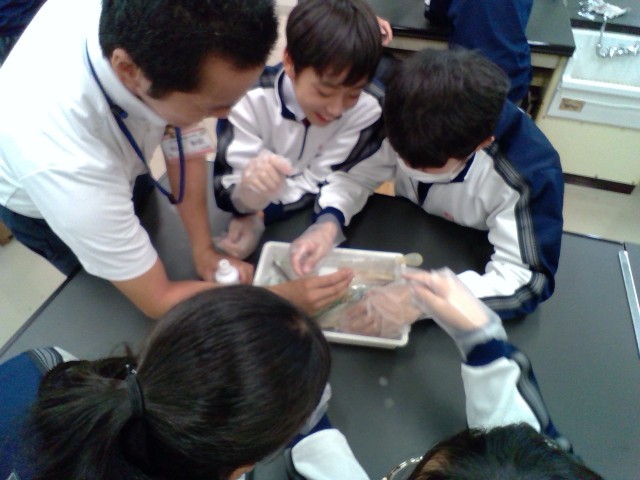 吸盤の爪や口の様子を観察し、解剖ばさみを使ってイカを切り開き、肝臓や胃、心臓やすみ袋を確認しました。最初は戸惑っていた生徒も、最終的には水晶体まで取り出して観察しました。