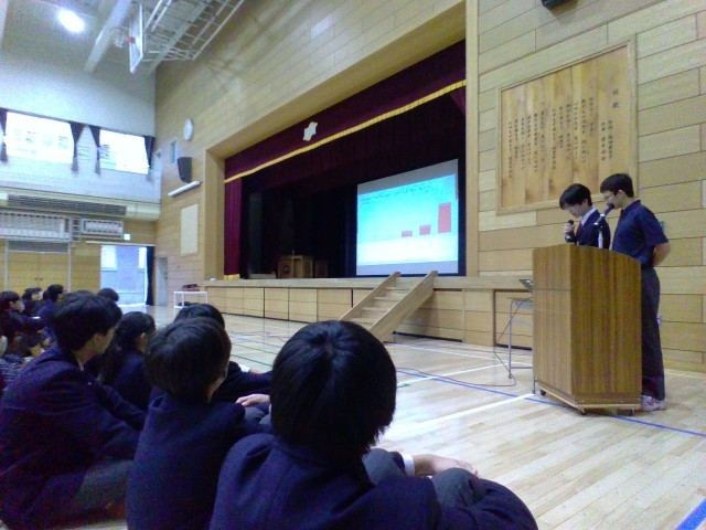 生徒朝礼では、選挙管理委員長が今回の生徒会選挙について行ったアンケートの結果を報告しました。報告内容の一部を紹介します。