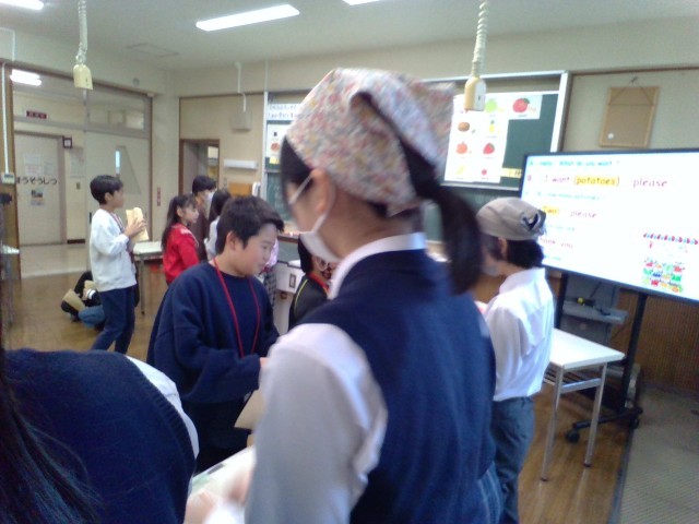 4年生の外国語活動では、「What do you want?ほしいものは何かな?」でスペシャルランチボックスを作るための食材集めを通して英語でのやりとりを行いました。