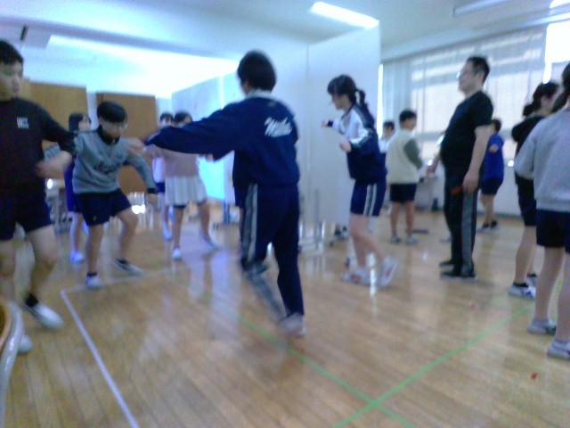 6年生の体育では、グループに分かれて創作ダンス、現代的なリズムのダンスを行いました。中学生から教えてもらい、最後にグループごとに発表会を行いました。