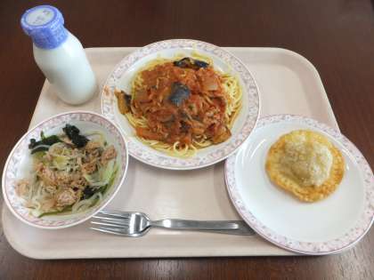 本日の給食の献立は、ナスとトマトのスパゲティ・ツナ入り海藻サラダ・ひまわりパイ・牛乳です。ひまわりパイとは、かぼちゃペーストを餃子の皮で包んで揚げたお菓子です。季節感のある献立でした。