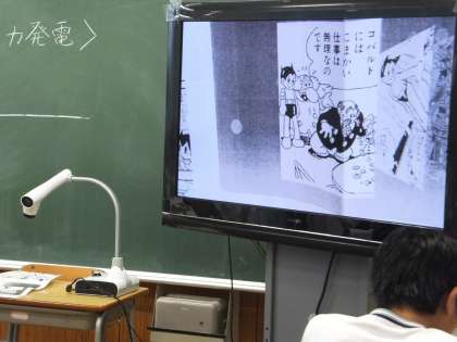 2年生、社会科の授業の様子です。内容は、日本の資源・エネルギー問題で、主な発電方法の特色や問題点を考え、ワークシートにまとめていました。授業の導入では、「鉄腕アトム」の漫画を使うなどして、生徒の興味・関心を高めていました。エネルギーについては、理科や技術科でも扱う内容なので、連携がうまくできればより効果的になると感じました。