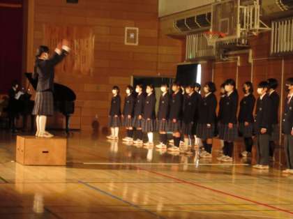各学年の行事として1・2校時に1年生、3・4校時に3年生の学年合唱発表会を実施しました。1年1組「HEIWAの鐘」、1年2組「COSMOS」、1年3組「大切なもの」、1年4組「行き先」、3年1組「流浪の民」、3年2組「春に」、3年3組「モルダウ」3年4組「信じる」、3年課題曲「大地讃頌」を発表しました。どのクラスも大変すばらしい合唱でした。3年生の合唱は、1・2年の教室にライブ中継され視聴しました。