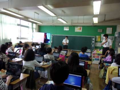 今回の小中連携は、さくら小学校で実施しました。授業参観では、分科会ごとの授業を行いました。特に6年1・2組の英語「Summer Vacations in the Word」と4年2組の理科「電気のはたらき」では、中学校の教員がメインで授業を行いました。写真は、上から英語、理科、分科会の様子です。