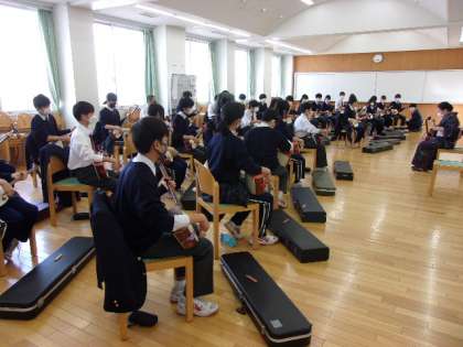 先日の箏に続き、今日は、三味線の授業です。講師を招いて、1人1台の三味線を準備して行いました。みんな真剣に三味線を弾いていました。