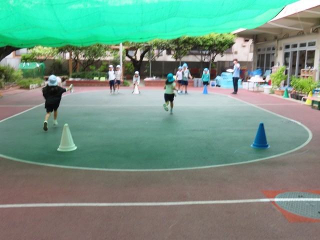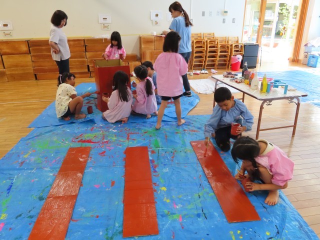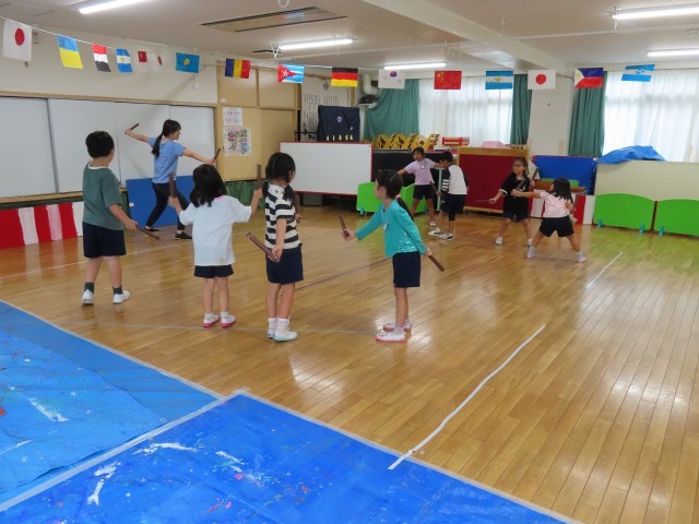 今日は、運動会に向けていろいろなミッションがありました。まず、太鼓をたたくバチを茶色のテープで貼りました。次にみんなで太鼓をのせる台の色を茶色に塗ってから、作り途中だった提灯の上と下を取り付けました。午前中の最後は、踊りの練習です。隊形移動や踊りの振り付けをみんなで練習しました。ポーズがだんだんカッコよくなってきました。お弁当を食べてから、最後はリレーの練習をしました。コーンのまわり方が上手になってきました。来週も運動会の練習を頑張っていきます。