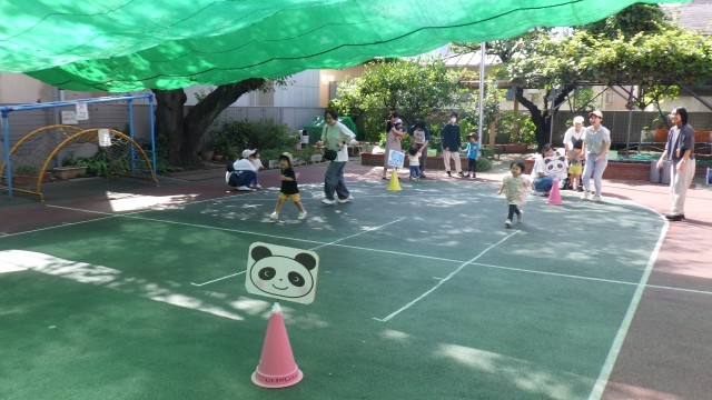 後半、外では、運動会ごっこを行いました。よーいどんの合図でスタートし、おなかをすかせたうさぎさんまで走り、りんごをどうぞ。