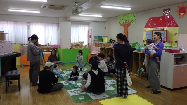 運動遊びは久しぶりの電車ごっこ。みんなで輪になって長い布を引っ張り、右に左に体をたくさん動かしました。