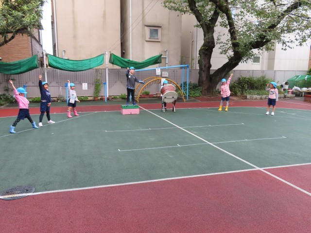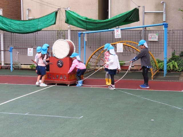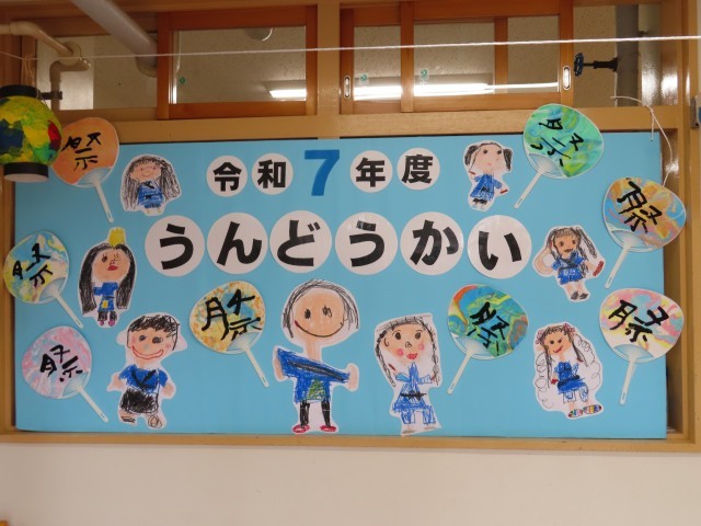 今日は、運動会の看板をほしぐみ前の廊下に貼りました。看板には、自分が踊っている姿を絵にかいて貼ってあります。一人ひとりが「祭」と書いたうちわも貼ってあります。午前中に、応援とダンスの練習もしました。声の出し方や動作を確認して、細かいところを練習しました。運動会本番を目指して、練習を頑張っています。