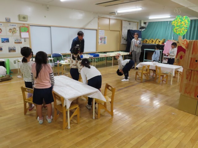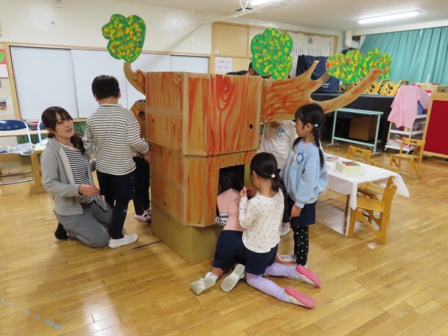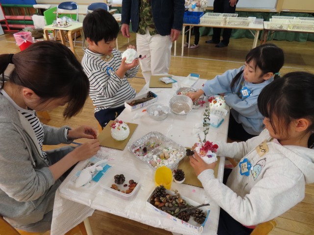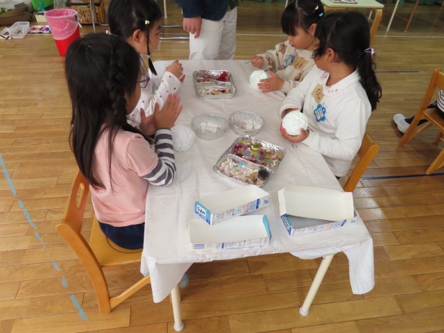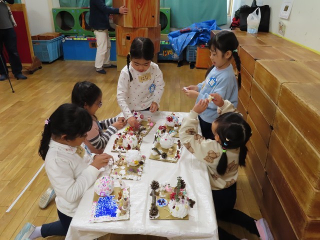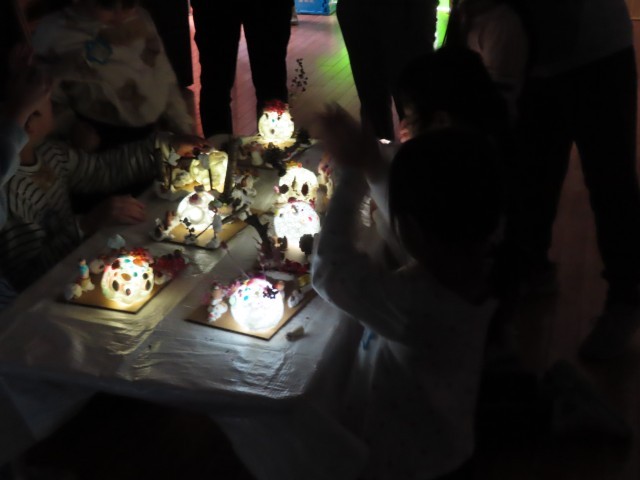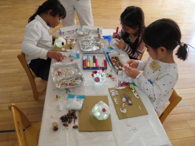 今日は、「次世代文化の担い手」育成事業として、芸術家と子どもたちの先生が来てくれました。アーティストの先生から「どんぐりくんの家」の作り方を教えてもらってから遠足で拾ってきた「どんぐり」を使って家を作りました。光るボールに粘土をつけて、いろいろな形をスタンプしたり、どんぐりや花や貝殻などをつけたりして、一人一人が工夫して自分の家を作りました。ホールを真っ暗にしたら、みんなの家は光ってとてもきれいでした。最後に、木のムロのお家にみんなが作ったお家を入れて、中で光っている自分やお友達の家を外から覗いて楽しみました。お世話になった先生たちにしっかりお礼も言うことができました。今日も楽しい活動でした。