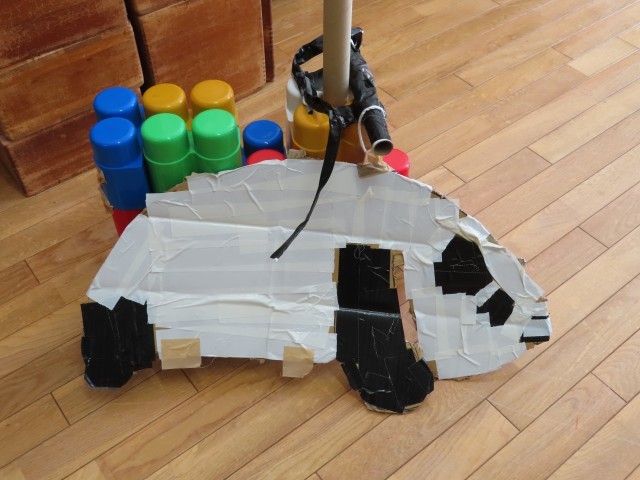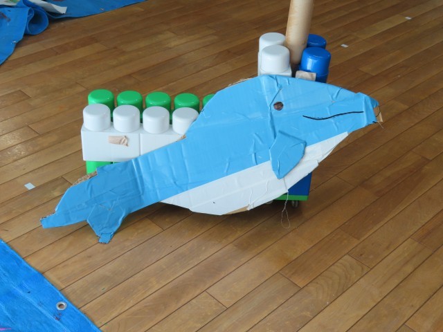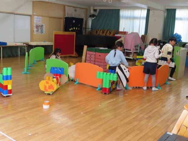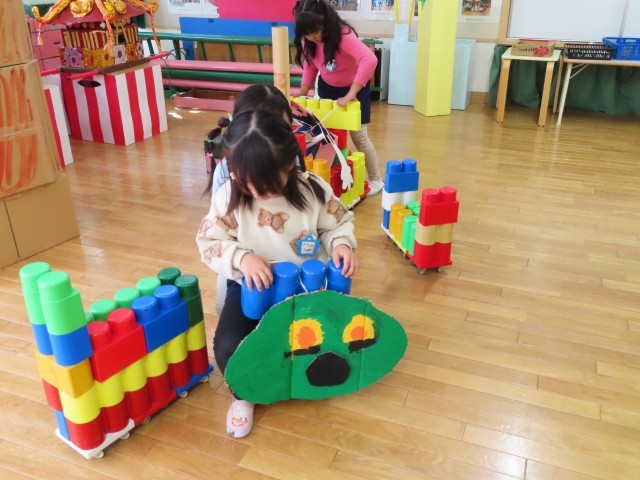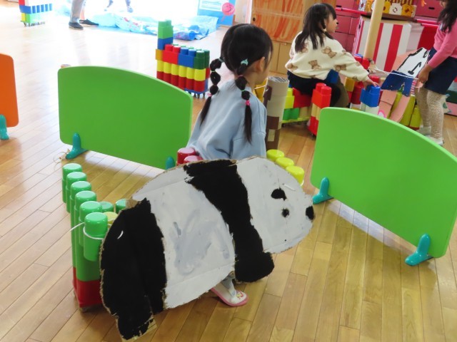 昨日の遠足で行ったあらかわ遊園を思い出して遊園地を幼稚園で作りました。メリーゴーランドで自分が乗った「パンダ」や「イルカ」、ファミリーコースターのいもむしの顔を段ボールに描いてキングブロックに貼って滑って遊びました。