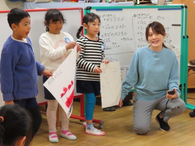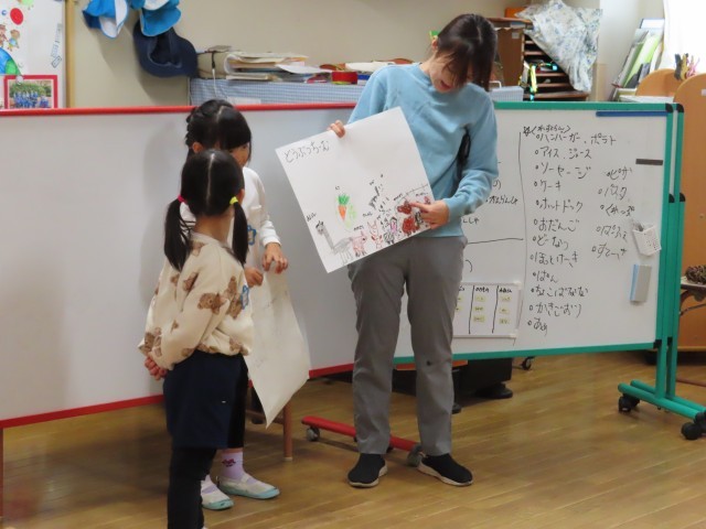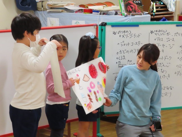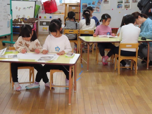 今日は、朝一番に「リース作り」をしました。小学校に植えたサツマイモのつるを使ってリースを編んでいきました。先生たちが昨日から準備をしておいてくれたので楽しくできました。お弁当の前、約1時間、「遊園地ごっこ」の話合をしました。「乗り物」「レストラン」「動物」の3つのグループに分かれて「どんなものを作るのか、材料にはどんなものが必要か」を話し合って絵に描きました。とても上手に話し合いができていました。ちょうど幼稚園の様子を見に来ていた中学校の先生が感心していました。