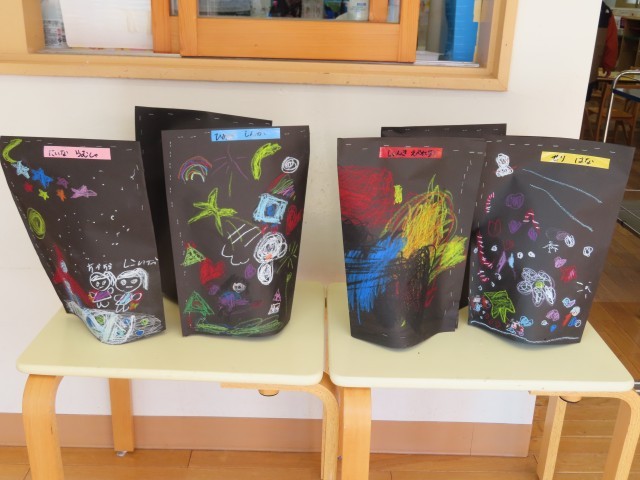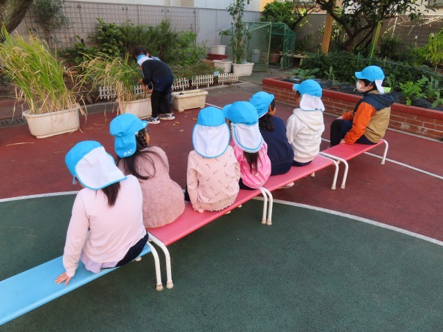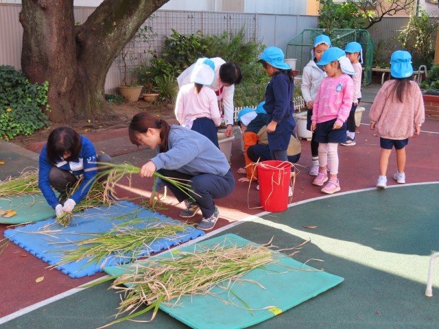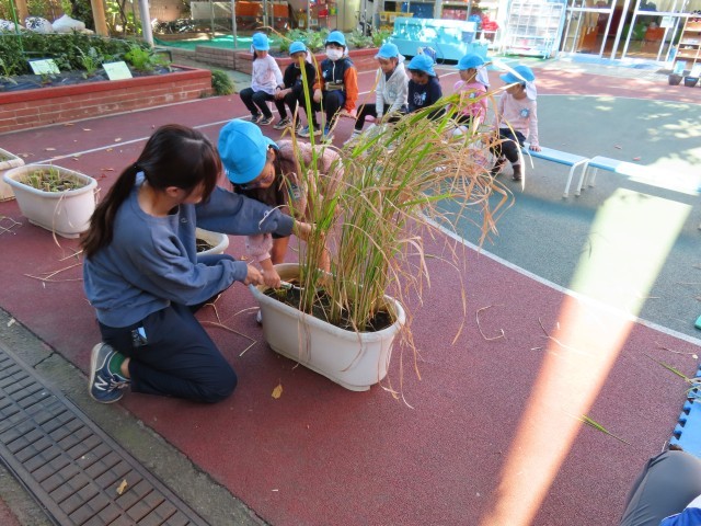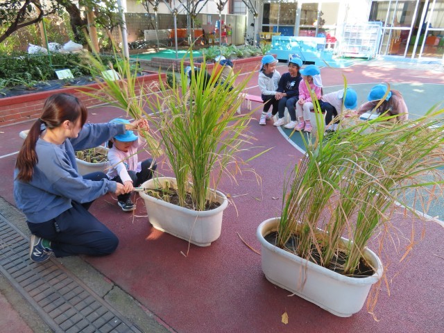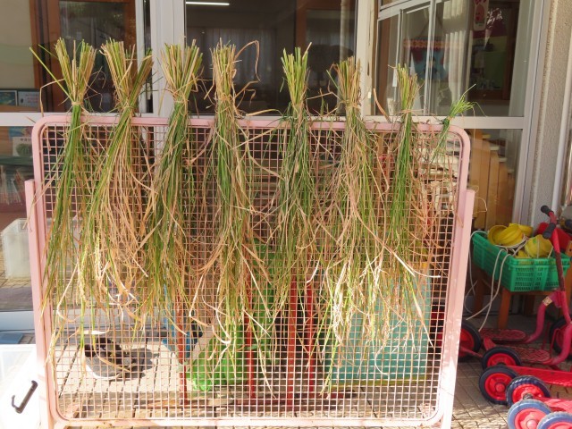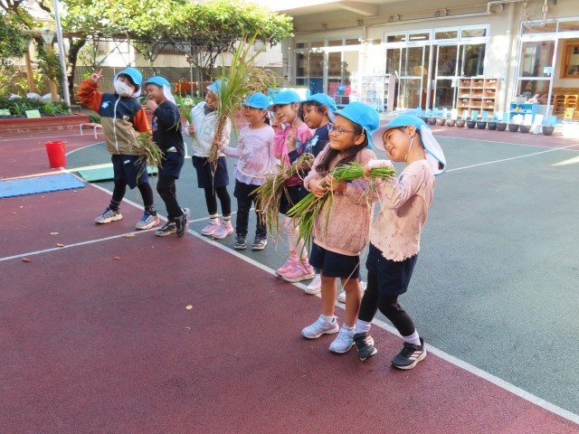 今日は、大きなプランターで育てたお米の稲刈りをしました。一人ずつ鍬を使って下のほうから刈りました。刈り取った稲を先生たちが束ねてくれました。先生たちが束ねている間にみんなでお掃除をして藁をたくさん拾いました。最後に、束ねてもらった稲を干しました。稲を刈ったり、束ねた稲を干したり、体験ができて楽しかったです。お弁当の前には、ヒヤシンスの球根を植えました。黒い画用紙に自分たちで絵を描いて袋の形にして被せました。どんな色の花が咲くのか楽しみです。