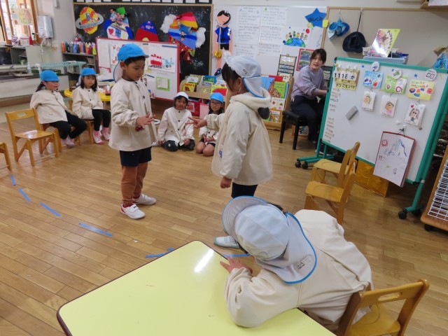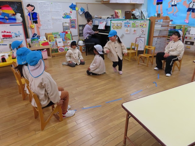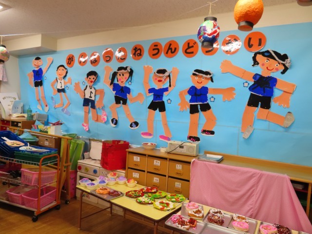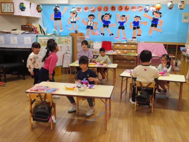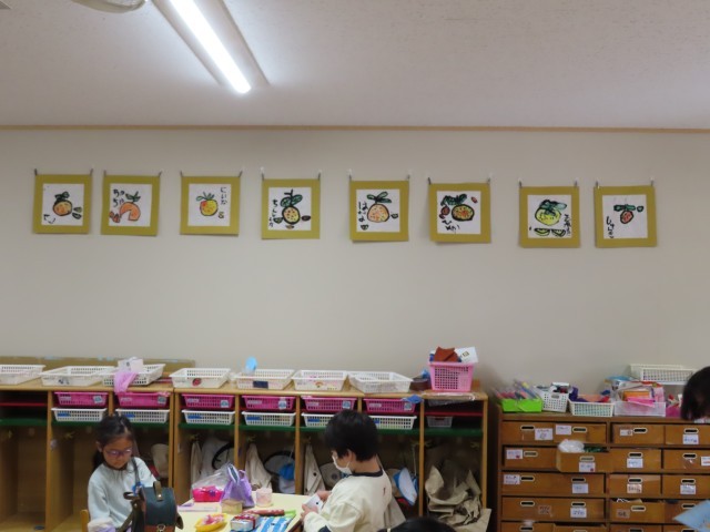 昨日から「作品展」に向けて3チームに分かれて遊園地を作り始めています。ほしぐみのお部屋には、前に作った全身画とミカンの絵が飾ってあります。全身画のテーマは、運動会でダンスを踊っている自分とリレーを走っている自分に分かれています。ミカンの絵は、園庭になっているミカンを一人一人が描きました。色を混ぜてミカンらしい色を作るところから頑張ってみました。「作品展」で皆さんに見てもらいたいです。作った作品を見ながら「お弁当」をいただきました。帰る前に白組と青組に分かれて「アルプス一万尺」のゲームをしました。1対1の引き分けでしたが、盛り上がりました。