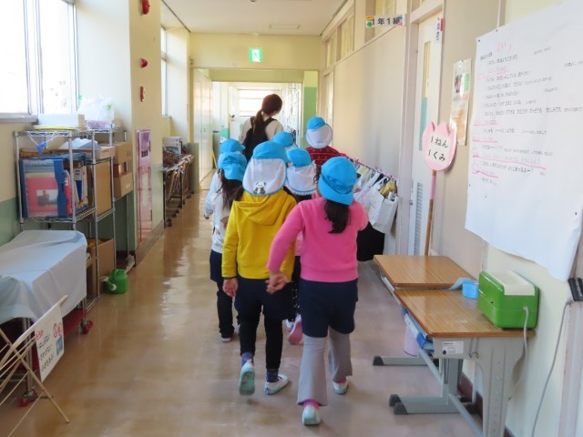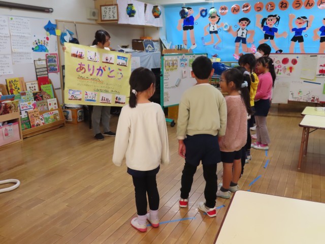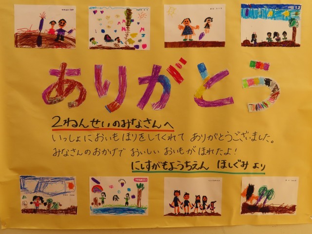 今日は、サツマイモ掘りでお世話になった西巣鴨小学校の2年生の皆さんにお礼の手紙を届けました。学校に行く前に幼稚園でお礼の言葉の練習をしてから行きました。お教室に入る前にもう一度練習をしたので、2年生の前でしっかり言えました。少し緊張しましたが上手に言えてよかったです。2年生が拍手をしてくれたのがうれしかったです。帰るときに学校を少し探検しました。給食の写真や図工の作品が飾ってありました。小学生の図工の作品はすごかったです。