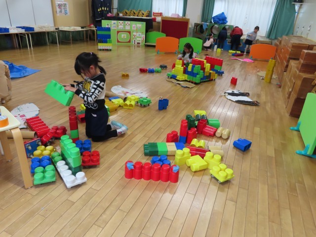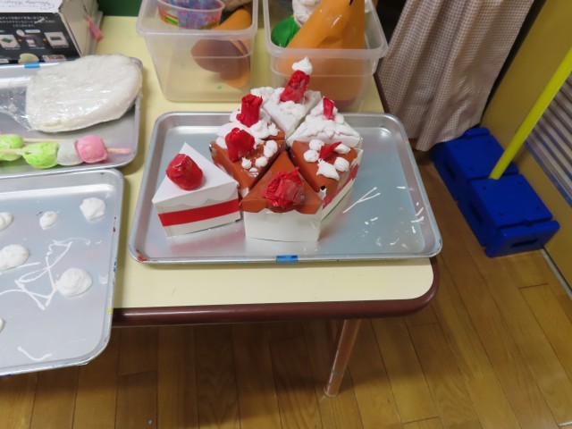 今日は、雨だったのでお部屋とホールで過ごしました。お当番活動を終えてから、遊園地づくりの続きをしました。動物チームは「カピバラ」の製作に取り組みました。乗り物チームは「豆汽車」の色塗りをしました。レストランチームは「ケーキ」を作りました。お弁当の前に今日からちいさなクリスマスツリーづくりを始めました。小さな飾りを作って色塗りをしました。出来上がりが楽しみです。午後は、ホールでキングブロックを使ってダイナミックに遊びました。外では遊べませんでしたが、楽しかったです。