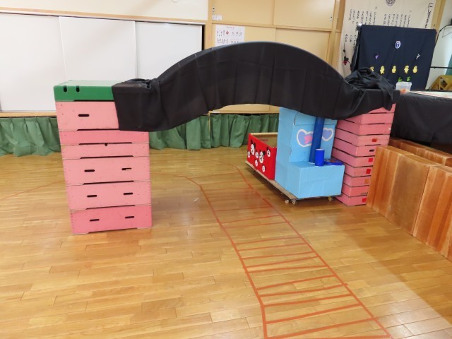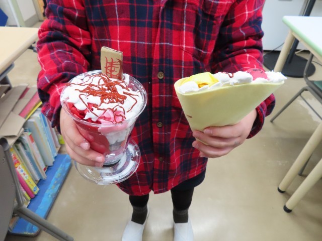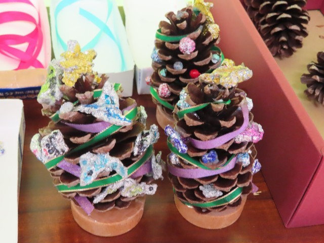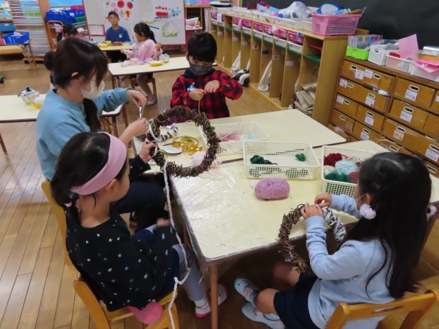 ミニクリスマスツリーが出来上がりました。今日は、お弁当を食べてからリース作りに挑戦しました。好きな色の毛糸を選んで根気よく巻いていきます。きれいなリースが出来上がると嬉しいです。午前中は、遊園地作りの続きをしました。レストランチームは「パフェ」と「クレープ」を作りました。いろいろな種類の商品が出来上がりました。豆汽車は、線路とトンネルを作りました