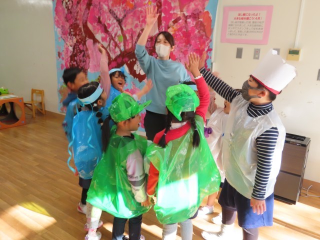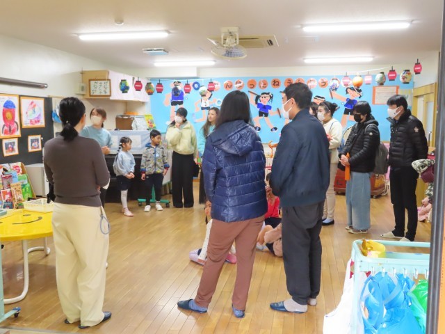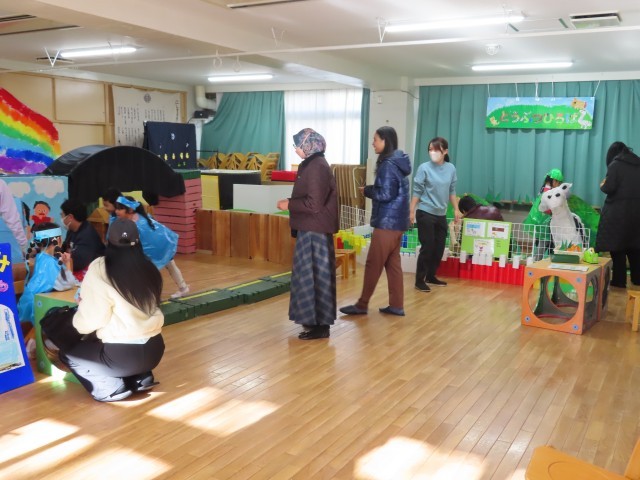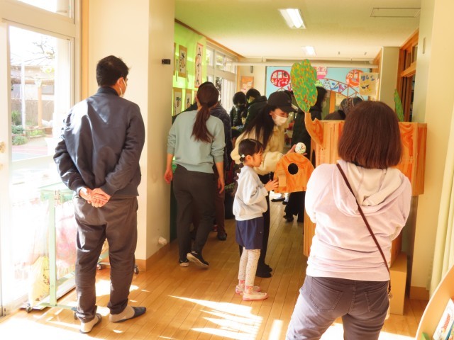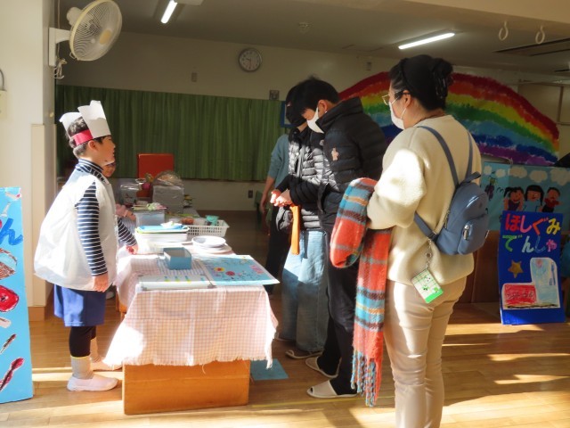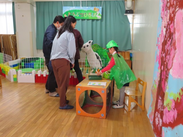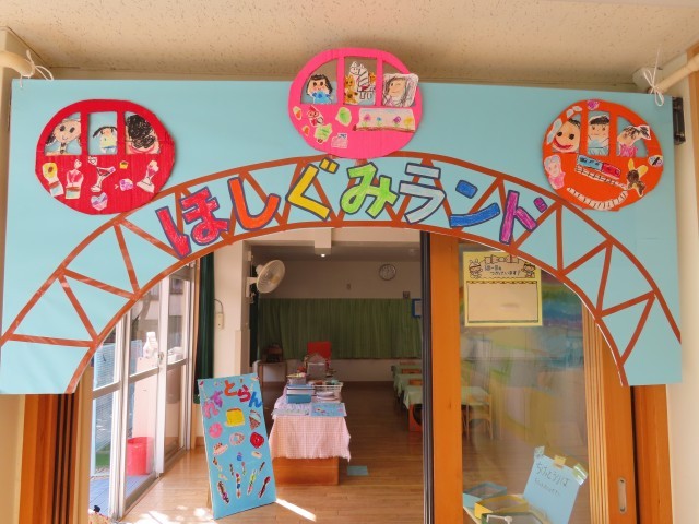 今日から「ほしぐみランド」と「作品展」がスタートです。今日は、ほしぐみのおうちの人たちが見に来てくれました。始める前に、全員で「がんばるぞ!オー」と声をかけてからおうちの人を迎えに行きました。前半は、「ほしぐみランド」で遊園地ごっこをして遊びました。「れすとらん」「ほしぐみでんしゃ」「どうぶつひろば」のキャストになっておうちの人をおもてなししました。明日からは、お客さんが変わるので頑張ります。後半は、おうちの人たちに自分が作った作品を案内しました。最後に写真を撮ってもらいました。おうちの人が作品をたくさんほめてくれたのがうれしかったです。