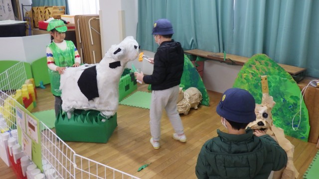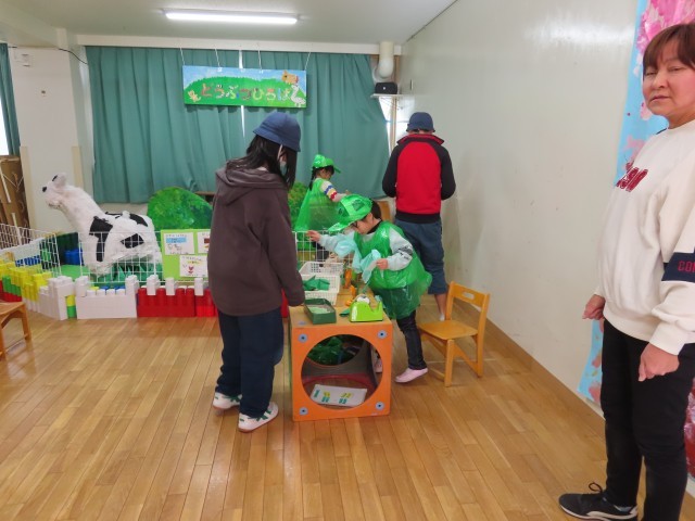 今日が「作品展」と「ほしぐみランド」の最終日でした。今日は、西巣鴨小学校の「たけのこ学級」のお兄さん、お姉さんが遊びに来てくれました。人数が多かったですが、最終日だったので、店員さんの仕事にも慣れてきたので頑張れました。小学校の皆さんもとても面白かったと最後に感想を言ってくれました。今年も「たけのこ学級」の皆さんが交流に来てくれたのでうれししかったです。そのあと、園庭で鬼ごっこをしたり、お部屋で工作をしたりして遊びました。この1週間、来てくださったお客様が作品やほしぐみランドのことをたくさんほめてくれたのがすごくうれしかったです。