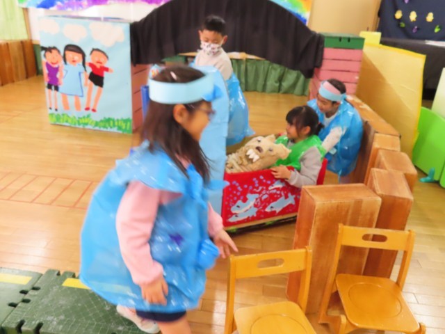 今日は、ほしぐみランドのお仕事を交換して遊びました。どのお店をしたいかみんなで相談してから始めました。先週とは違うお仕事をやってみたので楽しかったです。どうぶつひろばのお友達にレストランで食事をさせてあげました。午後は、外で宝取りゲームや縄跳びをして遊びました。帰る前に先生が今日も絵本を読んでくれました。面白いお話でした。