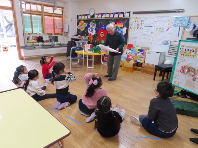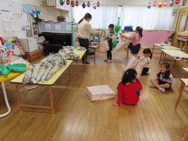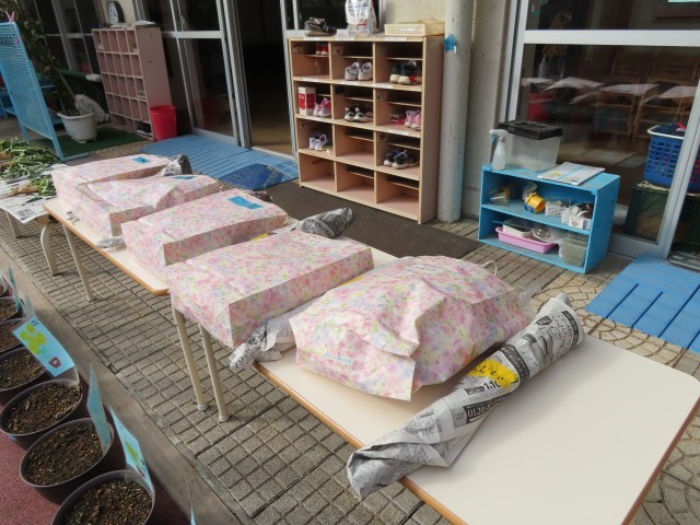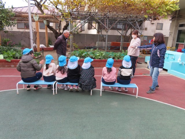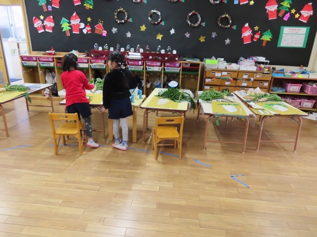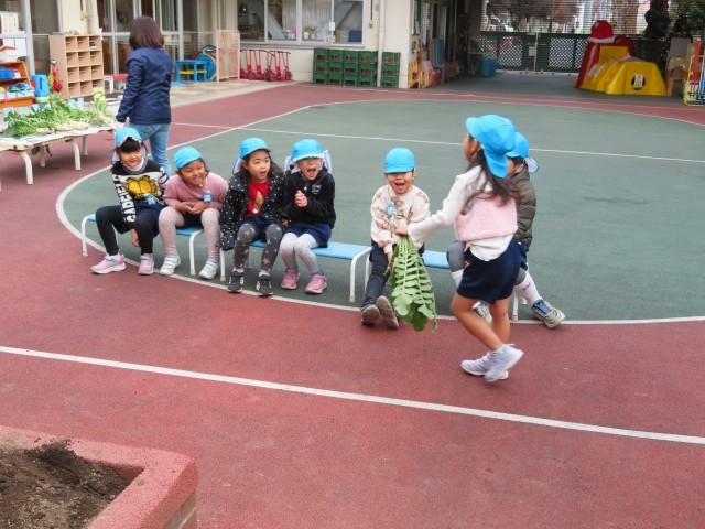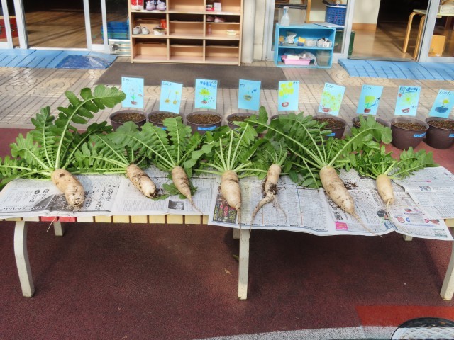 今日は、畑の先生が来てくれました。午前中にみんなで大根掘りをしました。種から育てた「おでん大根」「サラダ大根」などがしっかり育っていました。ちょっと力がいりましたが、一人一人が抜くことができました。そのあと、大根の絵をかきました。そして、作品展で製作した作品を大根と一緒に持って帰りました。今日は、みんな大荷物で「さようなら」をしました。