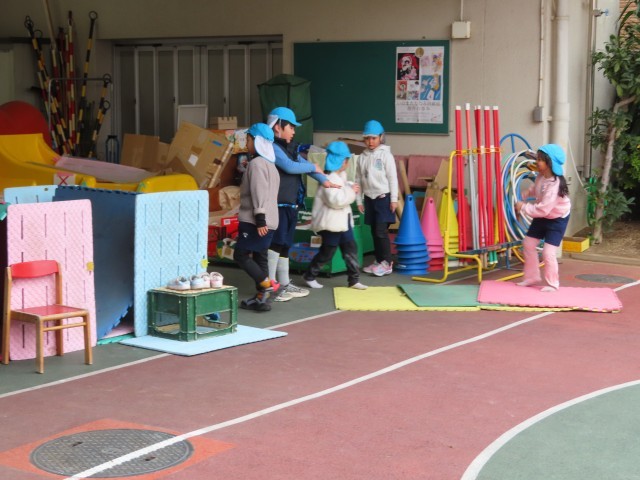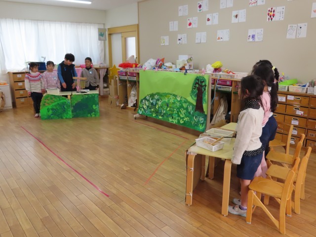 今日は、衣装づくりの続きや大道具の色塗りをしました。そのあと、寒かったけど園庭で外遊びをしました。お弁当の前に劇の練習をしました。午後は、合奏と歌の練習もしました。劇も音楽もだんだん出来上がってきています。
