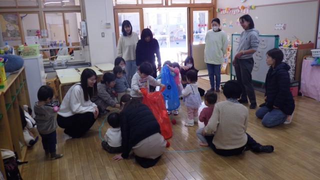 布遊びやふれあいの後は節分企画!みんなであかおに、あおおににお手玉を投げると空気で膨らんだあかおに、あおおには逃げていきました。