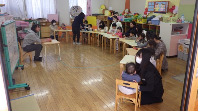 製作はだるまさん。起き上がり小法師になっている好きな色のだるまを選んで、「だるまさんが」の絵本に合わせて動かして楽しみました。