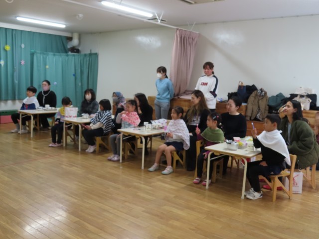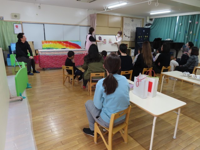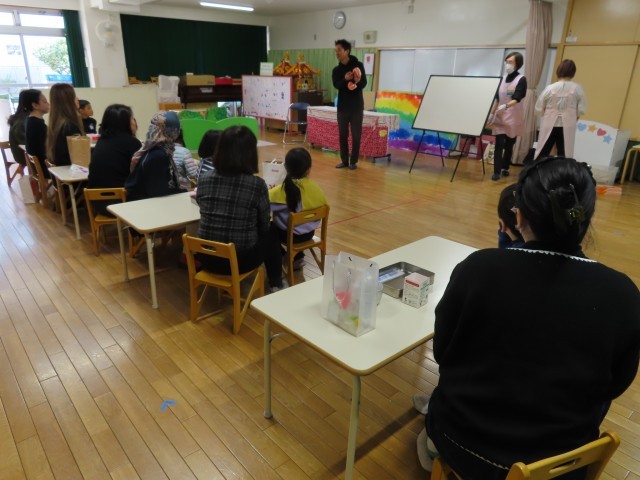今日の午後は、親子歯磨き指導がありました。歯科衛生士の先生が、パネルシアターや紙芝居、葉の模型を使ってお話をしてくださいました。その後に実際に歯磨きをしてから、染め出しをしました。よく磨けていないところをおうちの人に仕上げ磨きをしてもらいました。歯がつるつるになってきました。最後に歯科園医の先生が磨きにくい場所を教えてくださいました。歯磨きをしっかりして、歯を大切にしていきましょう。