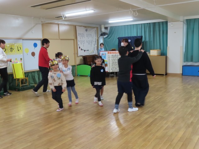 今日は、今年度最後の誕生会でした。2人のお友達のお誕生日をみんなでお祝いしました。プレゼントを渡した後におうちの人がお名前の由来をお話ししてくれました。