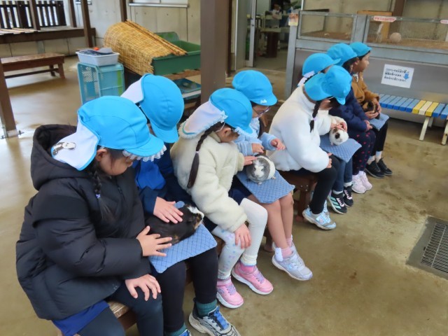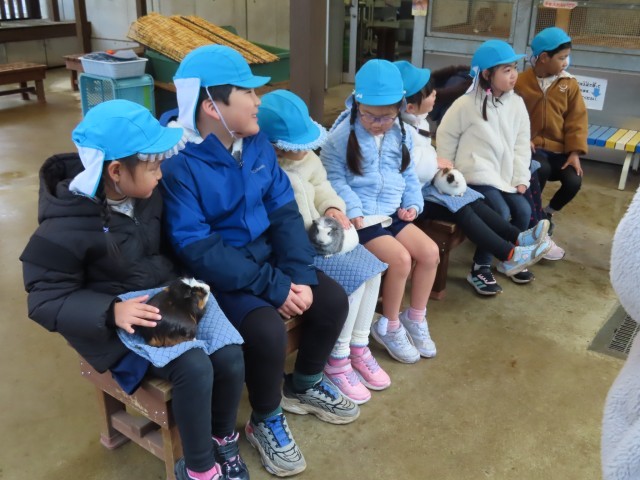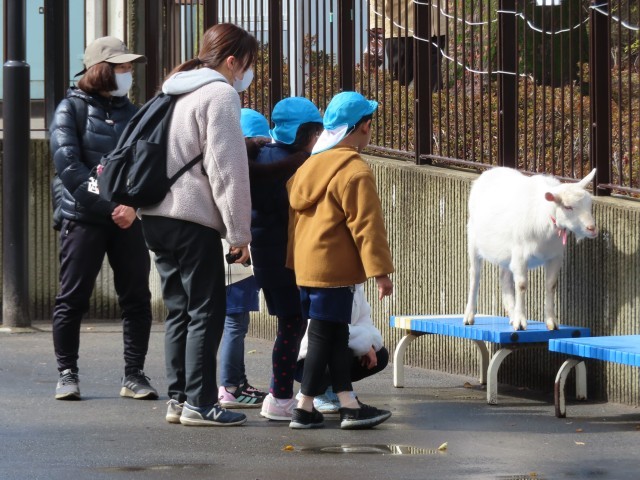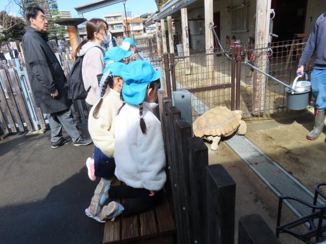 今日は、お別れ遠足で「板橋こども動物園」に行ってきました。はじめに「モルモット」を抱っこしました。とてもかわいく優しく背中を撫でてあげました。膝の上にいるときはとても温かかったです。そのあと「ヤギ・ヒツジの放し飼い広場」で動物と触れ合いました。横からそっと近づいて、優しく背中を撫でてあげました。ヤギもヒツジもとてもおとなしかったです。大きなリクガメも見せていただきました。事務所に戻って、記念のスタンプを押しました。お天気が心配でしたが、最後に楽しい遠足ができてよかったです。
