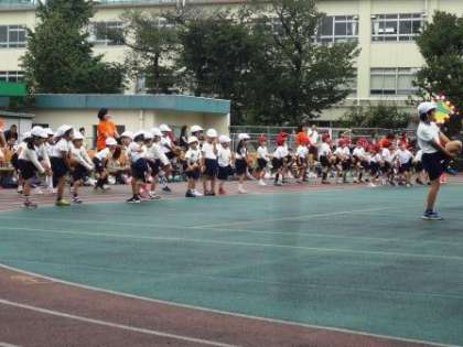小学校の運動会に参加しました。おうちの方や大勢のお客さんが応援してくださる中、西巣体操から一緒に参加し、応援や大玉送りを頑張りました。2へ続きます。