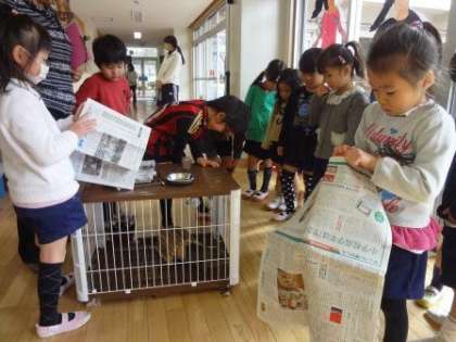 カメとモルモットのお世話は、年長さんの担当です。ほし組さんがお世話をする様子を、もも組さんが見学しました。