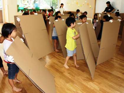 段ボールをもらうと、初めは平たいまま壁にして隠れたり、つなげてトンネルを作ったり…。その後、一人ずつガムテープで留めて箱を組み立てました。