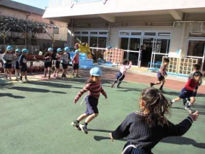 今日は、もも組とほし組で一緒にたくさん遊びました。じゃんけん汽車、ラウンドチェーン、しっぽ取りなど…。笑顔いっぱいに歓声を上げて盛り上がる子どもたちでした。楽しかったね。