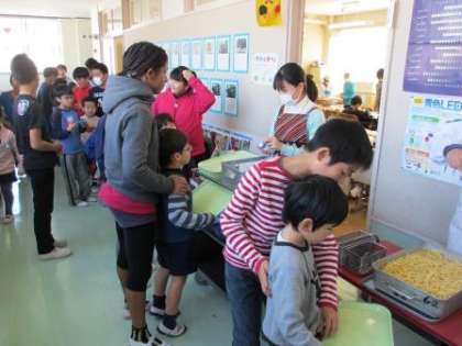 5年生の教室では、お兄さんお姉さんが笑顔で迎えてくれました。5年生も、ほし組が来るのを楽しみに待っていてくれたようです。今日のメニューは、スパゲティーミートソース、カラフルサラダ、オレンジゼリー、牛乳。「いただきまーす!」と、みんなうれしそうに頬張ります。おかわりも続出。楽しく歓談しながら、和やかなランチタイムになりました。