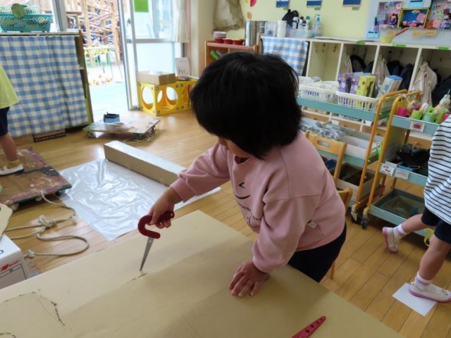 1人での製作とは違い、「ここ持っててくれない?」「もっとカラフルにしようよ」など、自分の思いをグループの友達に伝えながら段ボールを切ったり、色を塗ったりと作業を進める子どもたち。時には思いがぶつかり合いながらも、協力して作ることを楽しんでいます。