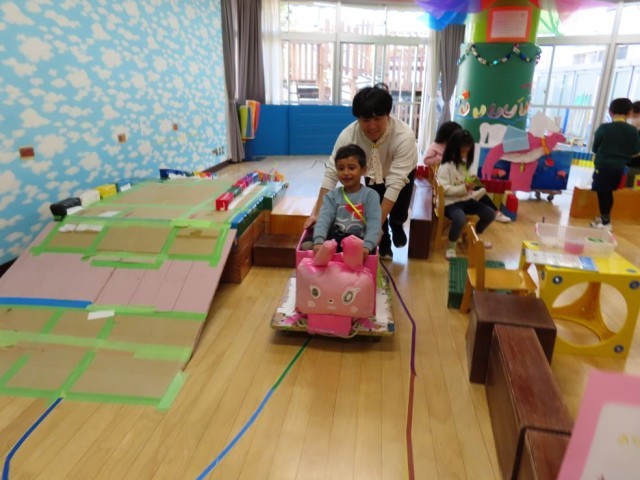 今日はこれまで頑張ったぶどう組さんを楽しませようと、先生達で遊園地を開き、ぶどう組さんを招待しました!