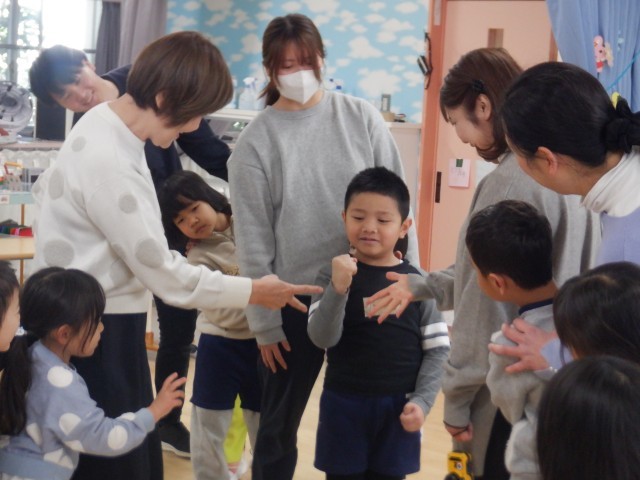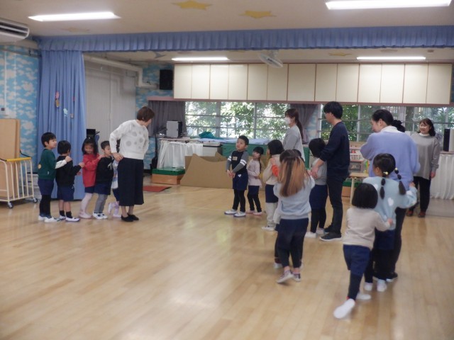 ひよこタイムのお友だちも、保護者の方や飛び入りで参加してくれたりす組と一緒に「わらべうた遊び」の楽しい時間を過ごしました。