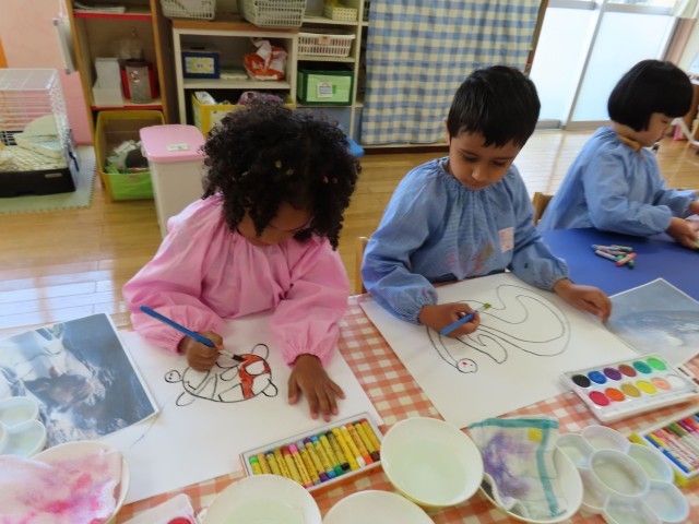 子どもたちは、シロクマの毛並みは真っ白ではなく少し色が付いていることや、亀の甲羅は一色では無いことなど、たくさんの気付きが表現された絵を丁寧に仕上げていました。