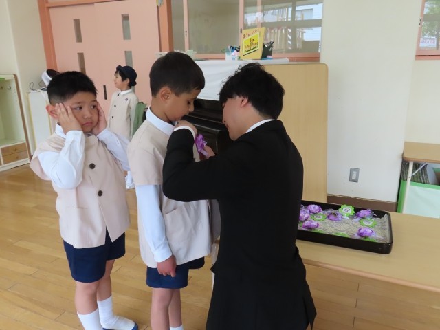担任の先生にコサージュをつけてもらうと、ちょっぴり緊張した顔に。
