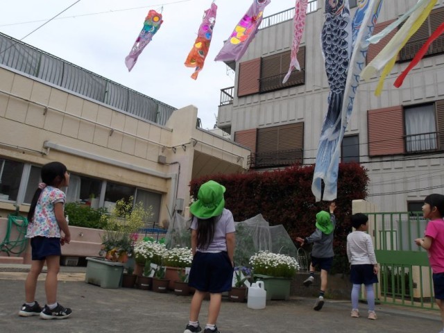 「わぁ高い高い!」「泳いでるよ!」色とりどりのこいのぼりが風に吹かれているのを見て、嬉しそうな子ども達。園庭を走り回って喜びを表現したり、少し離れた大型遊具の上から眺めたり、大喜びでした。